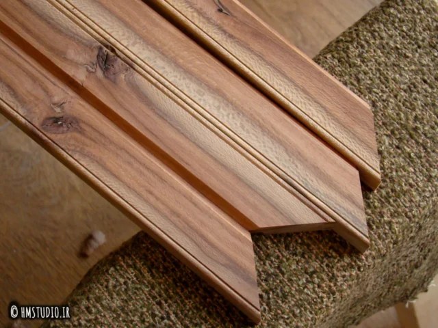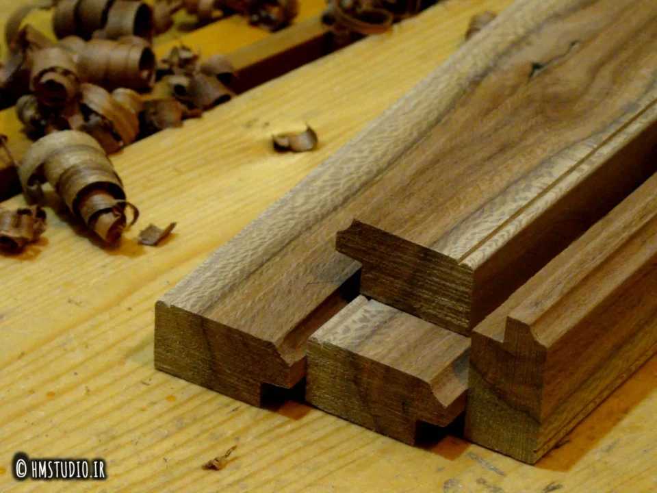 چوب هر ضلع قاب طوری انتخاب شده که طرح آن با چوب ضلع مقابل قرینه باشد. اتصال به کار رفته در گوشهها فارسی تقویت شده است که با دقت بالا اجرا شده است.